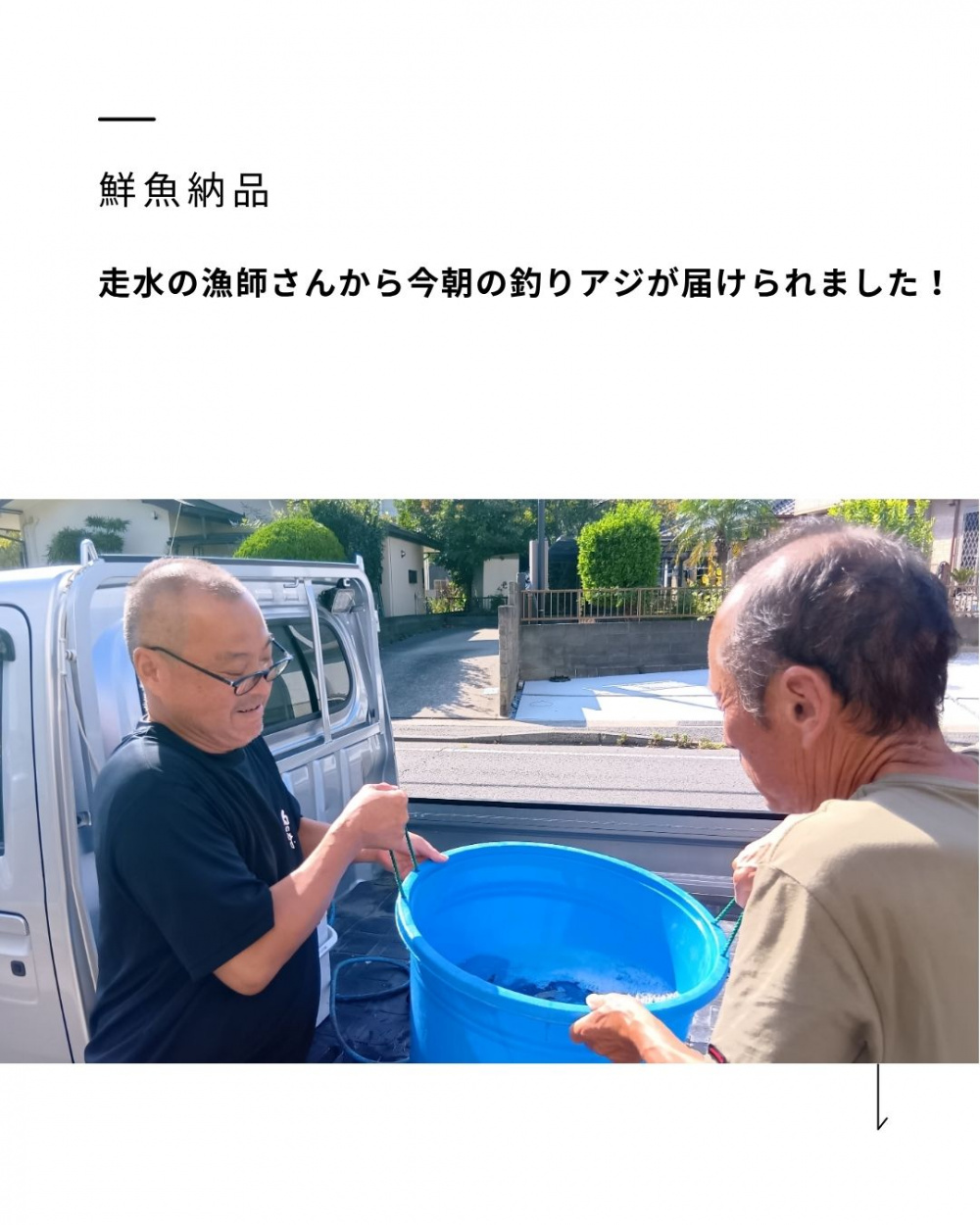 ちょうど訪問時、地元の漁師さんからの納品があり、活アジが生簀に追加される場面に遭遇!