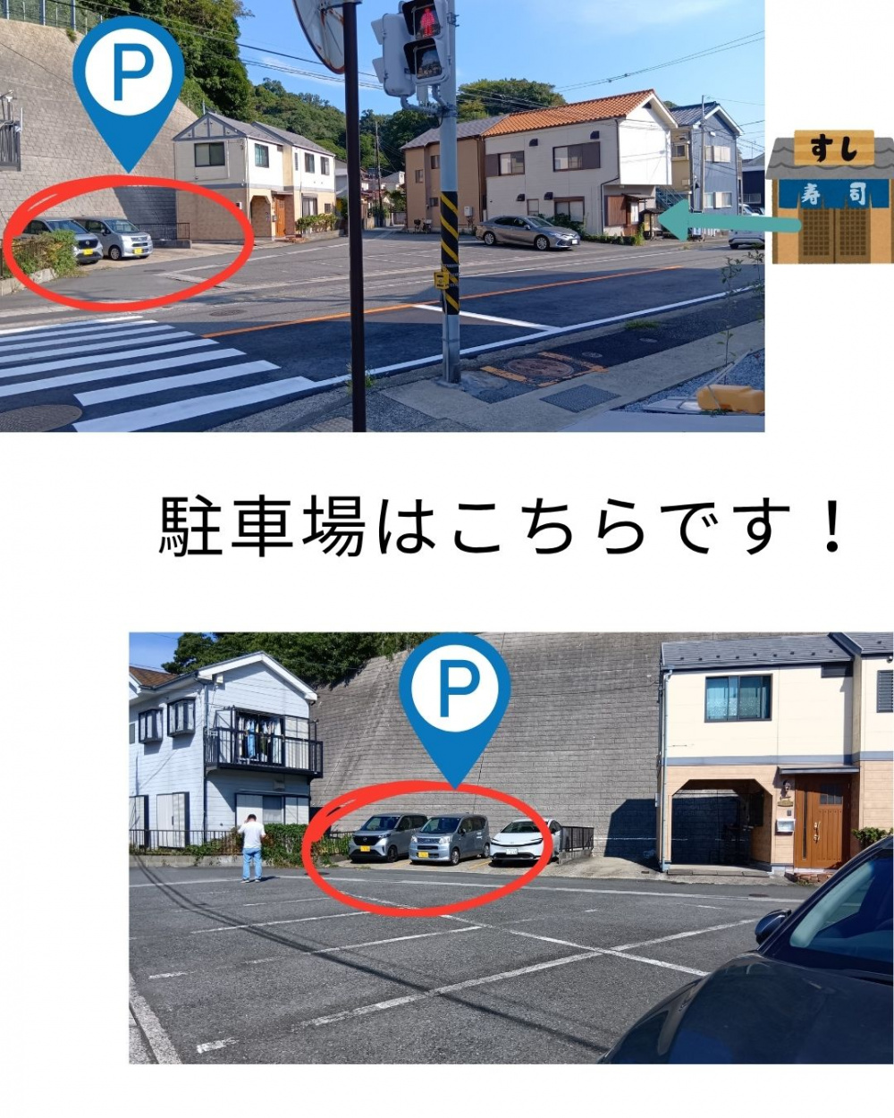 駐車場は3台分。お店の隣に広い駐車場がありますが、北浜寿し観音崎店の駐車場は、その奥の壁沿いスペースです(※画像参照)。