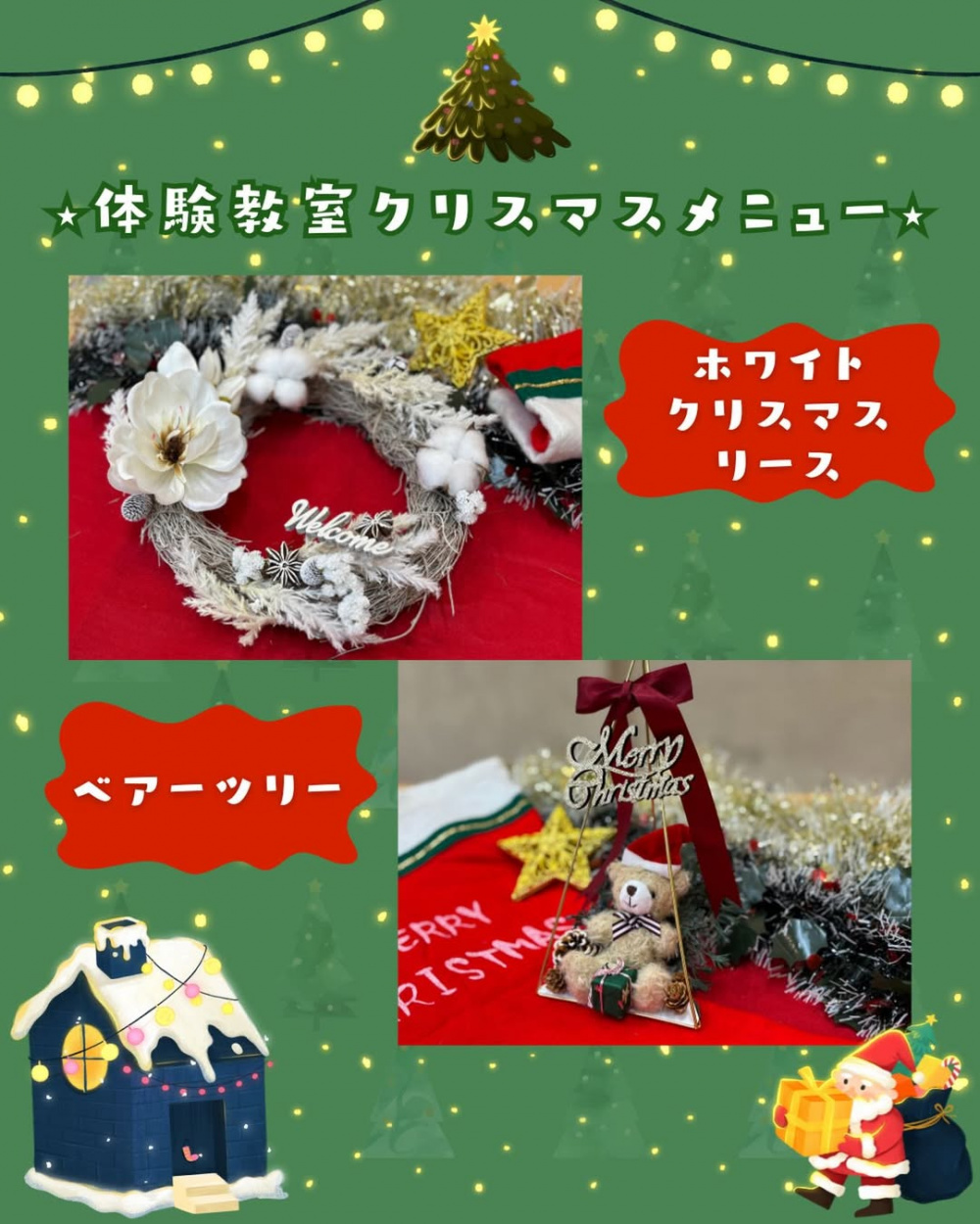 ホワイトクリスマスリースや、プレゼントを持ったかわいいクマさんのツリーを好きなようにアレジメントできるワークショップです。作品はお家のクリスマスのインテリアとして楽しめますよ!材料が無くなり次第終了なので、お早めに!