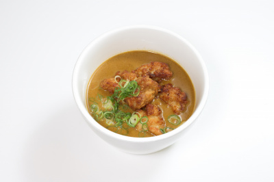 コシのあるツルツルとした自家製麺とスパイス・まろやかさが共存したカレーのコクがマッチ。ボリューミーな唐揚げとの相性も...