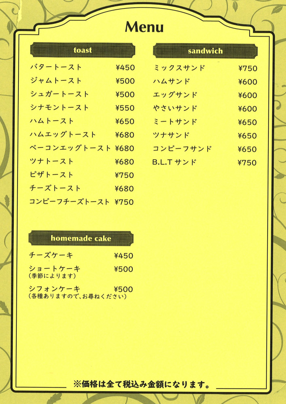 | テイクアウト(持ち帰り) | 有り サンドイッチ、パスタ、ピザ、ケーキ 他 メニューにあるものはテイクアウト可能です。 ぜひご利用ください。 |