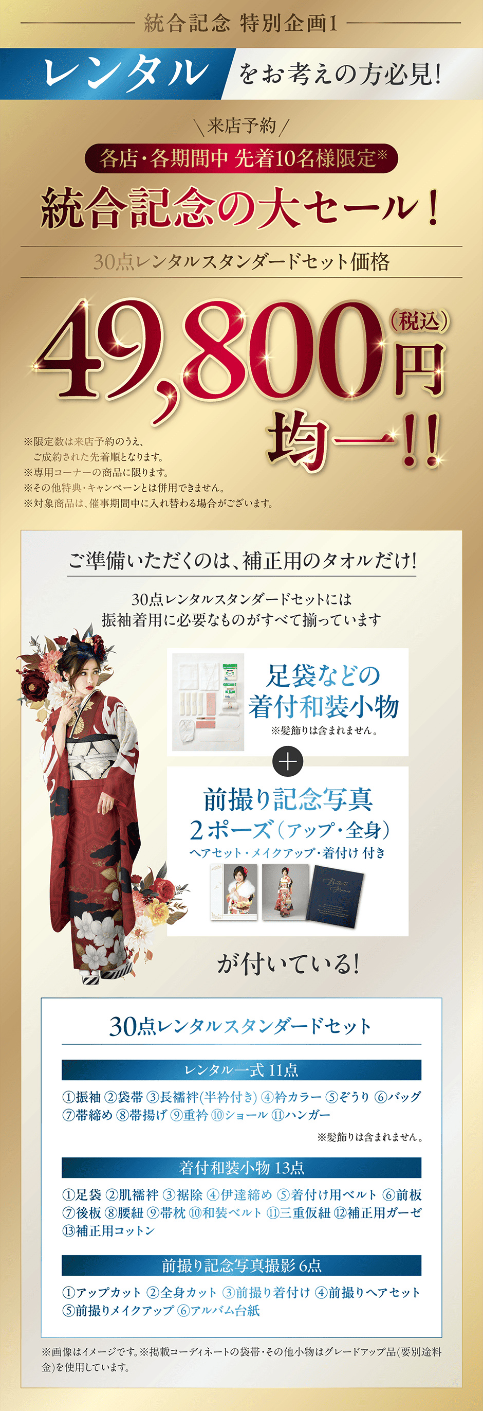 一蔵&オンディーヌ統合記念特別企画! 振袖レンタルセットが49,800円均一!など特別な商品をご用意しております。11/3まで