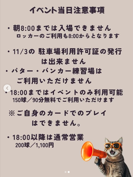 ・18:00まではイベントのみ利用可能(150球/90分無料)