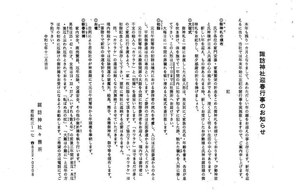 こちらは、若松町会会員様向けのお知らせです。ご確認くださいませ。3枚目は諏訪神社からのお知らせです。