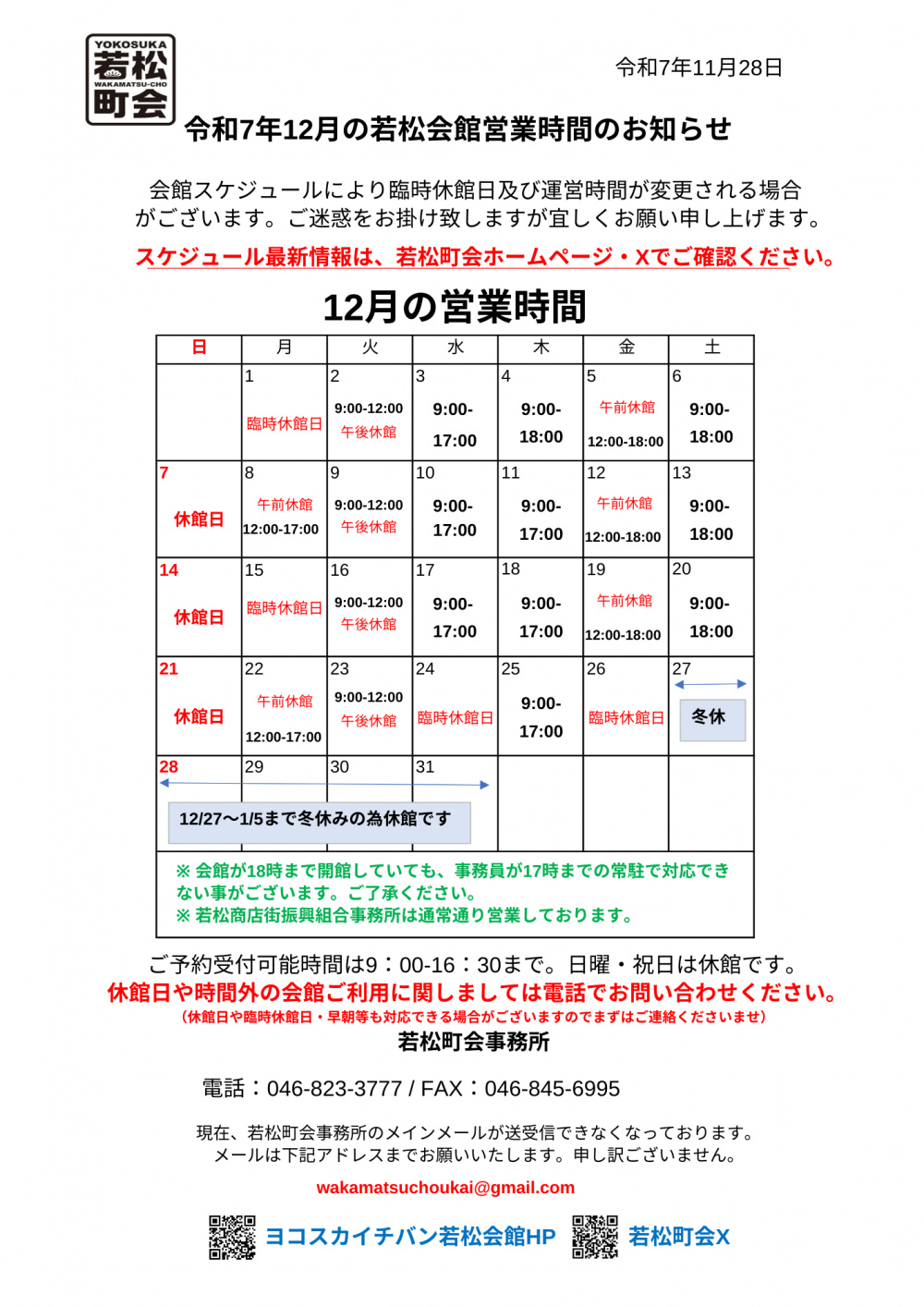 若松会館12月の営業時間のお知らせです。休館日や時間外のご利用に関しましては、対応できる場合がございます。電話でお問い合わせください。若松町会事務所:046-823-3777