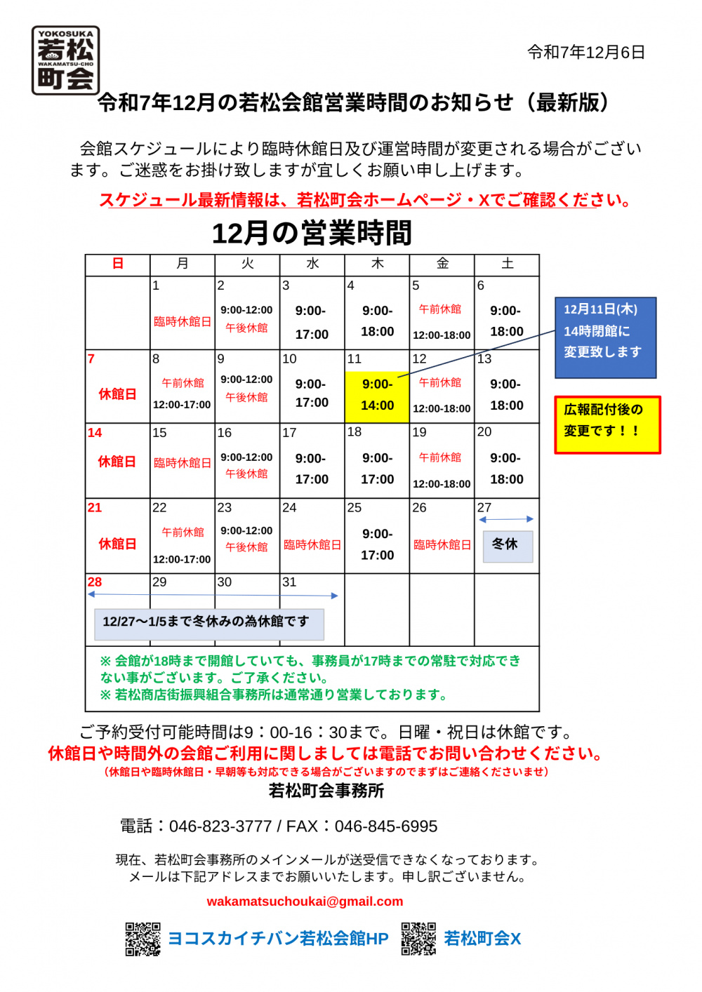 若松会館12月の営業時間の最新版です。広報で配付した後の変更です。ご迷惑をお掛け致しますが、よろしくお願いいたします。