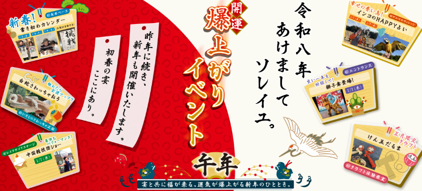 家族みんなで楽しめる縁起もの体験やフォトスポット、動物とのふれあいなど、1月のソレイユの丘が開運ムードでいっぱいです。