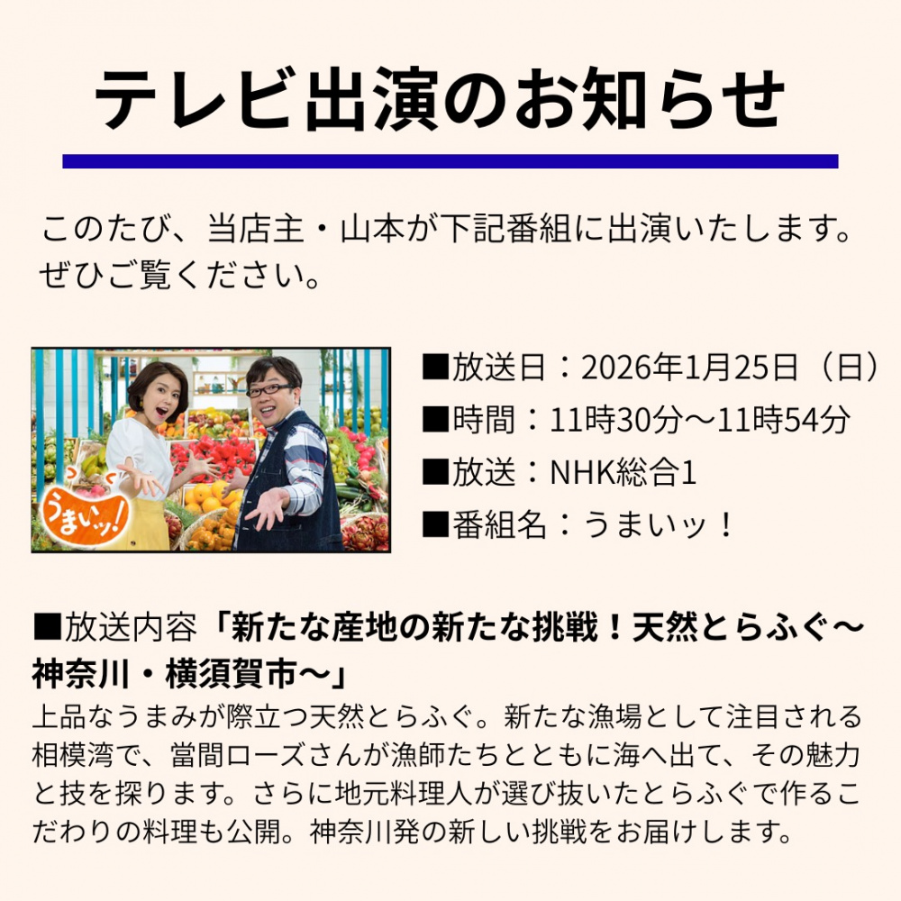 2026/01/23 <1/25>NHK総合「うまいッ!」に出演します