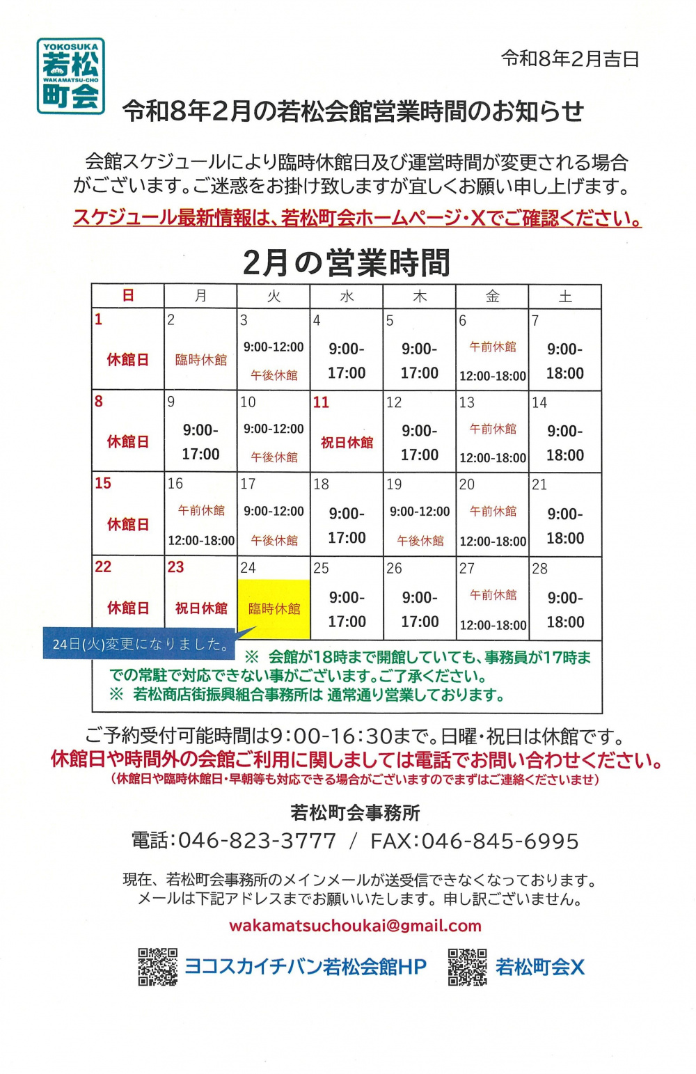 ※若松会館に関するお知らせを随時X@wakamatsuchouにて発信しておりますのでご確認ください
