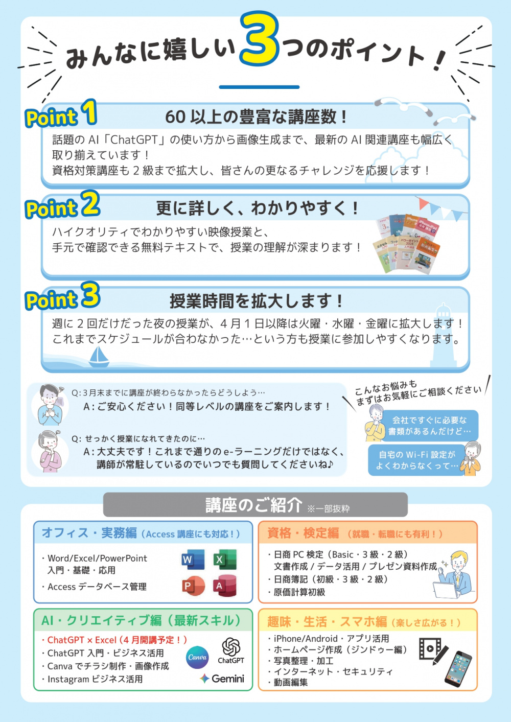 •最新AI講座の導入: Word・Excel等の実務講座に加え、話題の「ChatGPT」活用術、CANVA講座など最新トレンド講座を多数追加します。