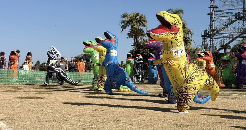 恐竜の着ぐるみ姿で、広大な芝生広場「のんびりはらっぱ」を全力疾走するユニークなレースです。