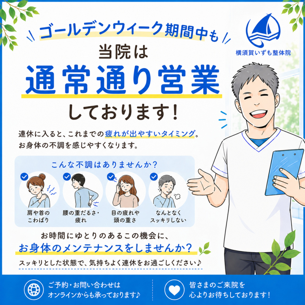 連休に入ると、これまでの忙しさから解放されることで、肩や首のこわばりや腰の重だるさ、目の疲れなど、溜まっていた不調を感じやすいタイミングでもあります…