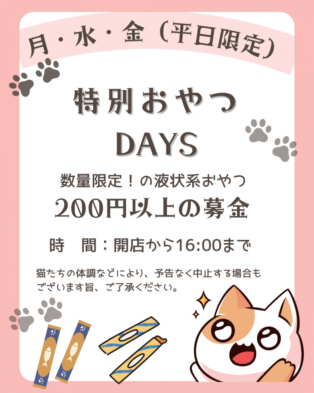 月・水・金(平日限定)で特別おやつDAYS開催! 200円以上の募金で数量限定で液状系のおやつをお渡しいたします。 時間...