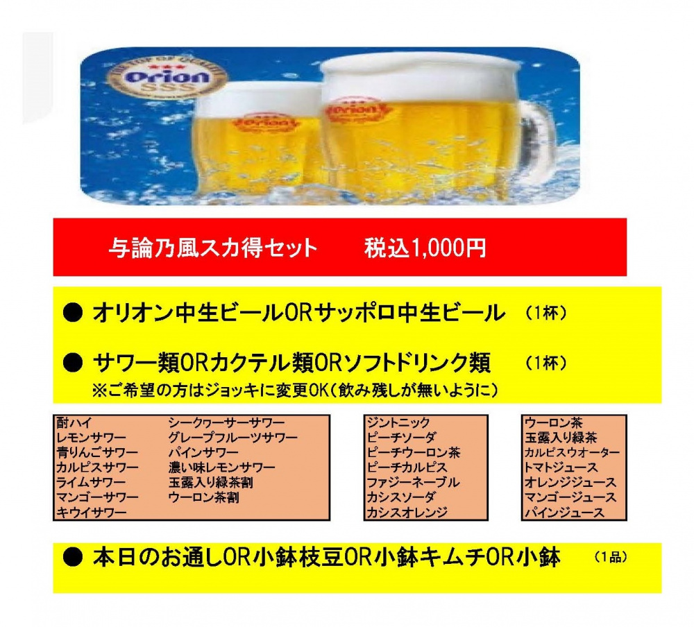 店内でお食事をご注文の方、グラス生ビール1杯サービス。 (注意事項) ●ヨコスカイチバン与論乃風ページ提示の方に(サー...