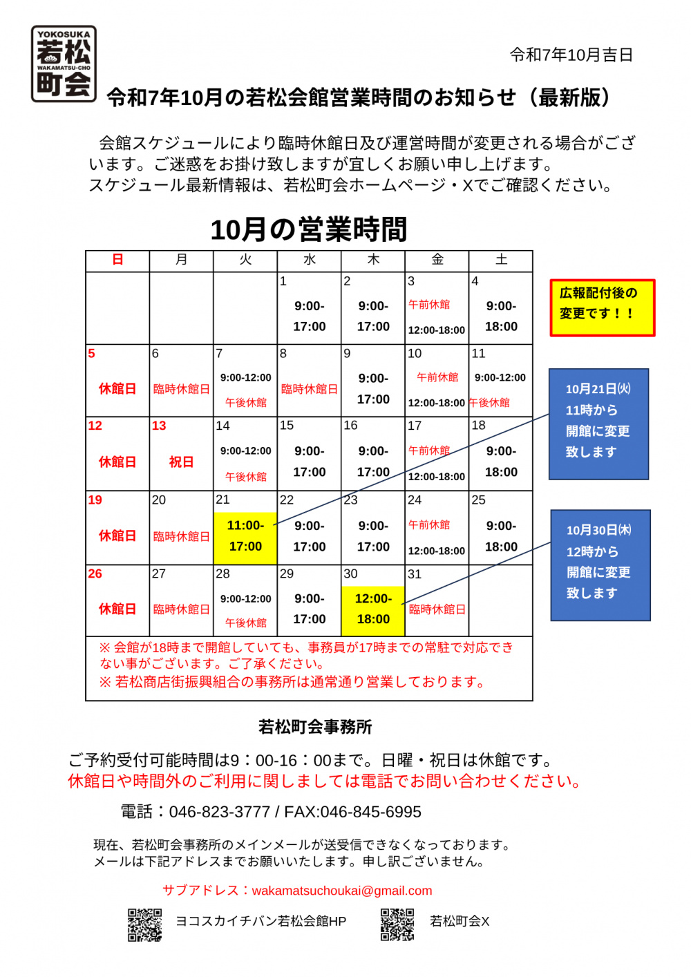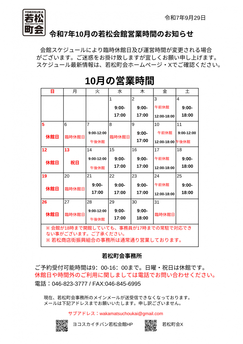 2025/10/14 最新版/10月臨時休館・運営時間変更のお知らせ