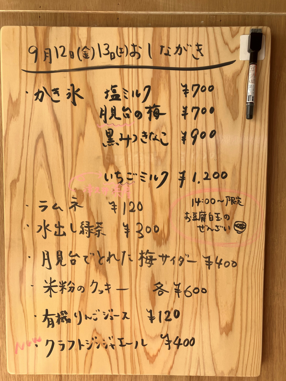 | その他 | 横須賀市田浦、月見台 / 天空の街、グルテンフリー、米粉スイーツ、米粉クッキー、岩手県産ひとめぼれ、甘味処、季節のスイーツ、季節のドリンク、梅サイダー、クラフトジンジャーエール、豆腐と白玉のぜんざい、かき氷、栗きんとん、チョコレート、のの字坂クッキー(田浦名物)、地元食材(梅・栗など)、薬膳 / 食養、心と体にやさしいお菓子、手作りスイーツ、おやつ時間、サイクリング・ハイキング立ち寄りスポット、眺望 / 別荘地のような雰囲気、今ここを大事にする |