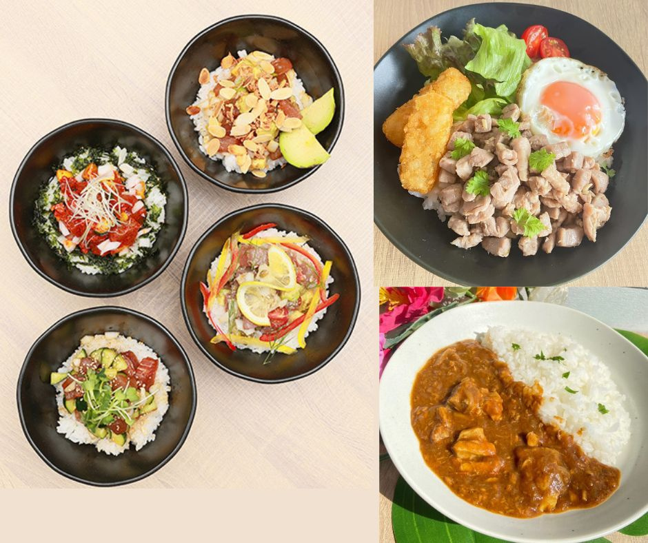 素材本来の旨味を生かしたポキ丼やマグロ料理、ガーリックシュリンプなど、このエリアでは珍しいメニューが揃います。