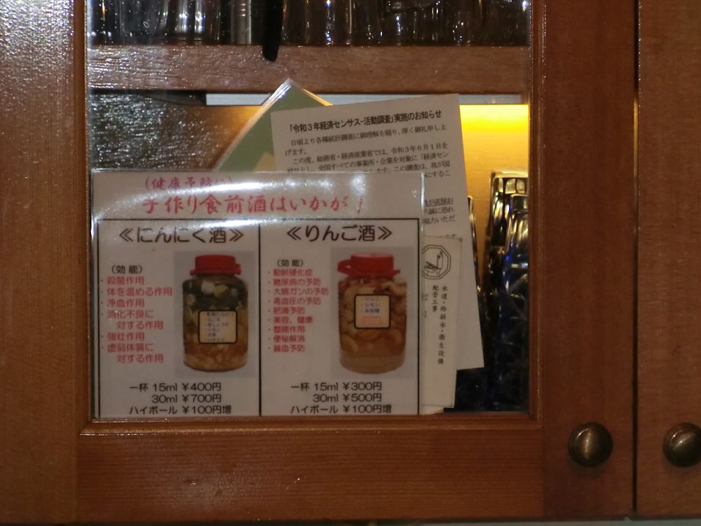 自家製果実酒各種あります。(ニンニク・大葉・みかん・青唐・サクランボ他)