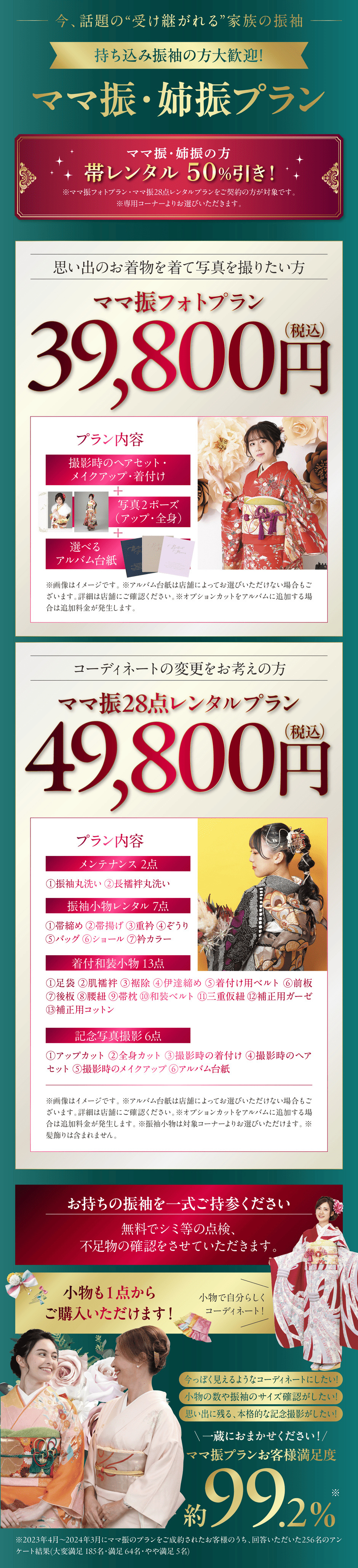 お母様やお姉様の振袖(ママ振・姉振)を活用したい方向けのプランも充実しています。
