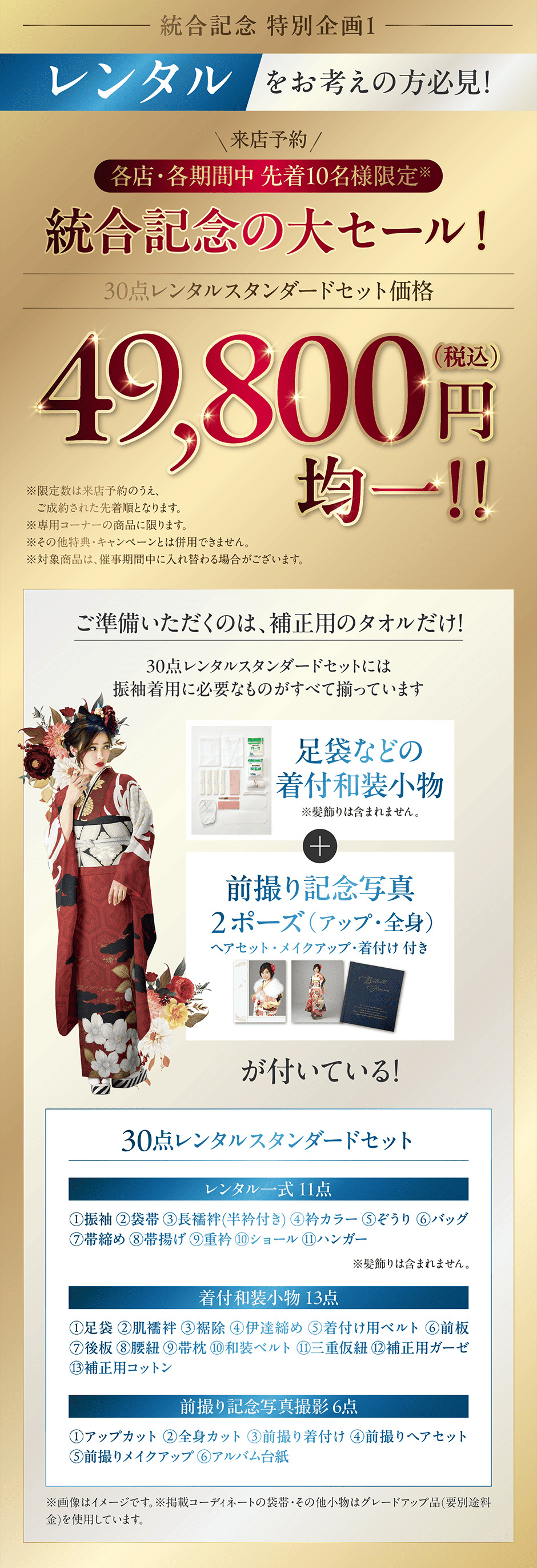 一蔵とオンディーヌの統合を記念した大セールで、振袖レンタルセットがなんと49,800円(税込)均一です!