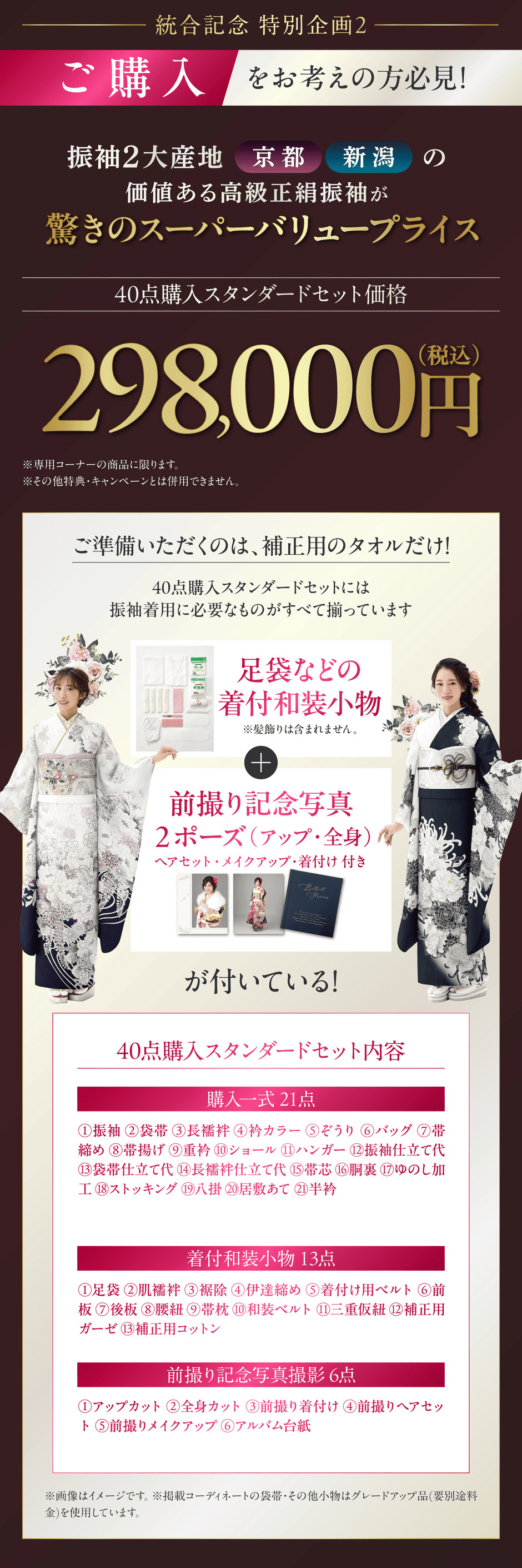 振袖の2大産地として知られる京都・新潟十日町の高い品質の振袖を、驚きのスーパーバリュープライスで提供しています。