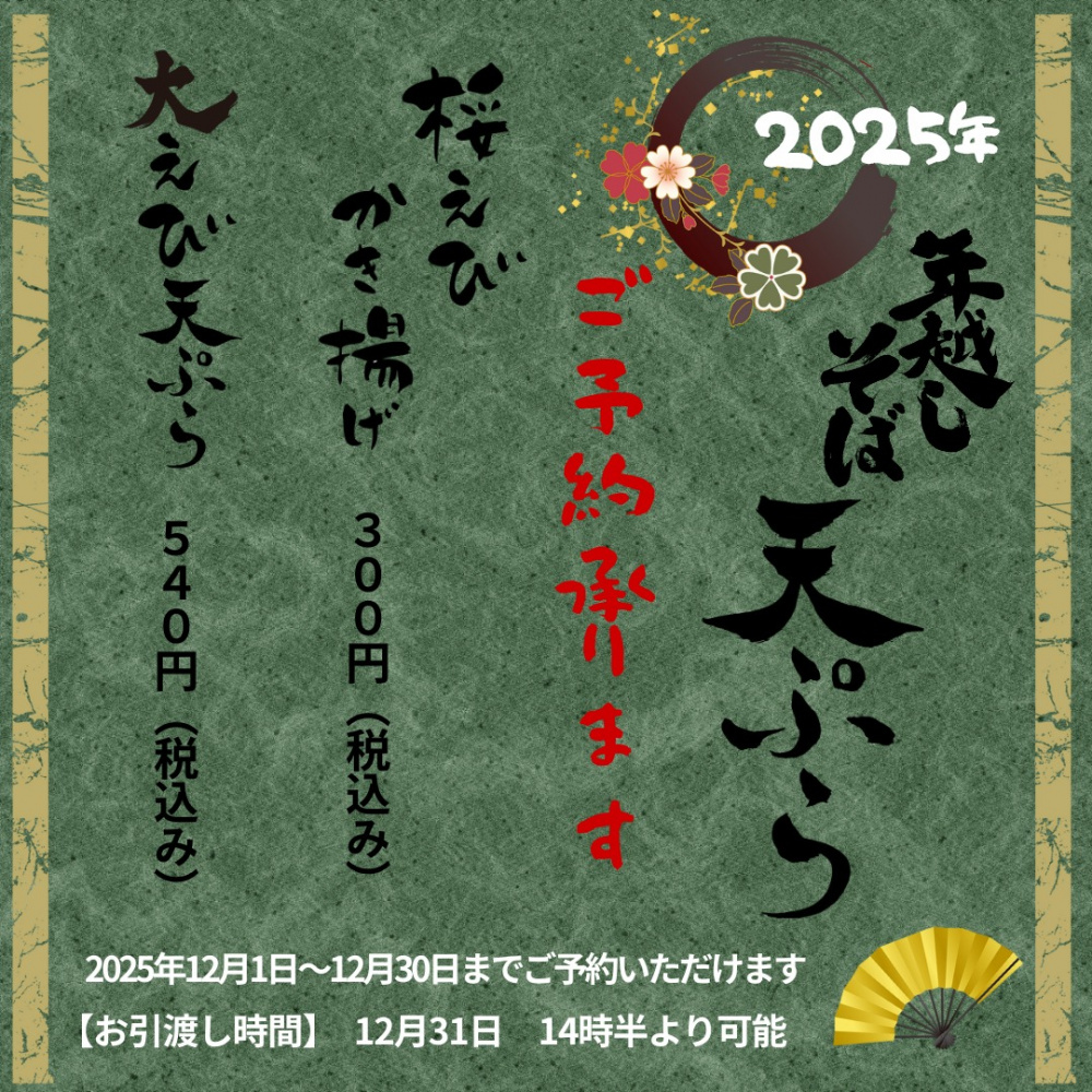 「お食事処やま本」では、昨年好評だった年越しそば用天ぷらの予約販売を、今年も実施しています。