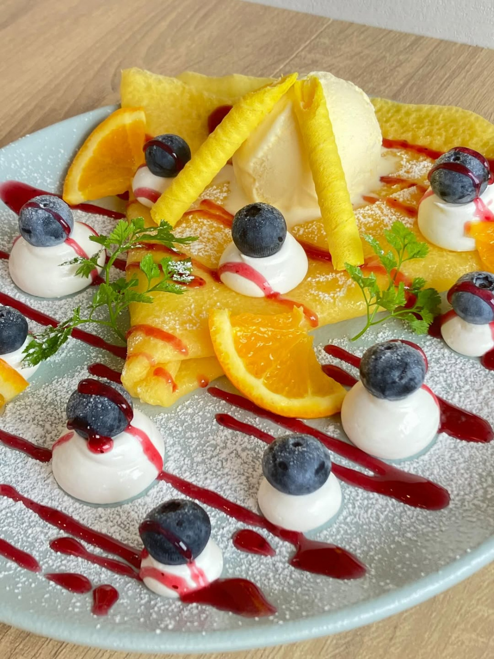 米粉を使用したもちっと食感のクレープをはじめ、季節のフルーツを使ったケーキやタルト、ロールケーキ、プリンなど、食後やティータイムにぴったりのデザートが並びます。