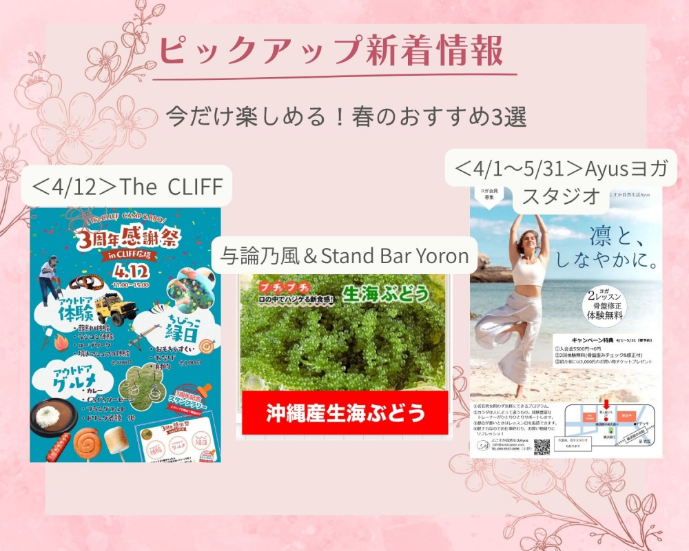 【ピックアップ新着情報】今だけ楽しめる!春のおすすめ3選|アウトドアイベント・海ぶどう・ヨガ体験キャンペーン